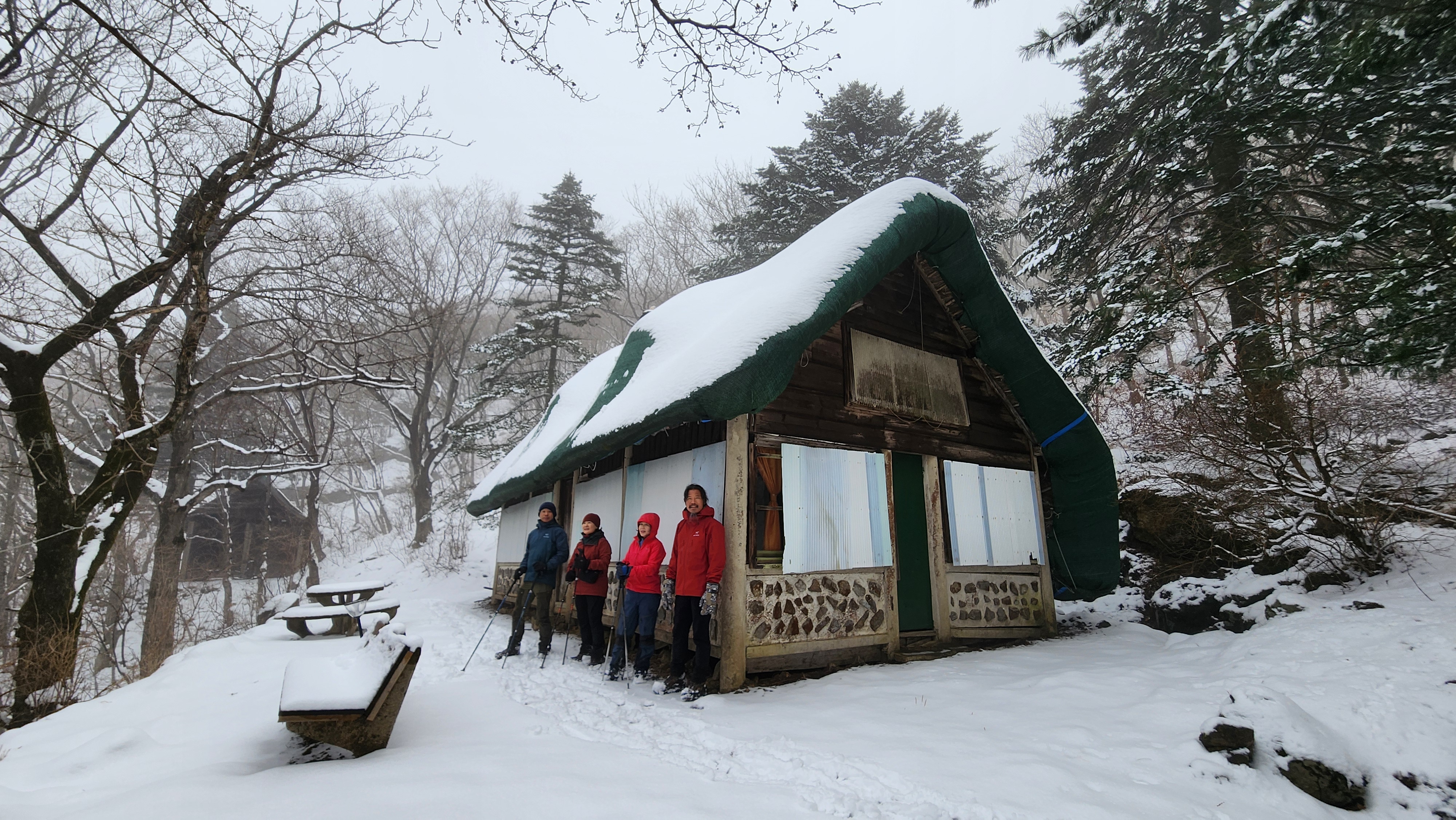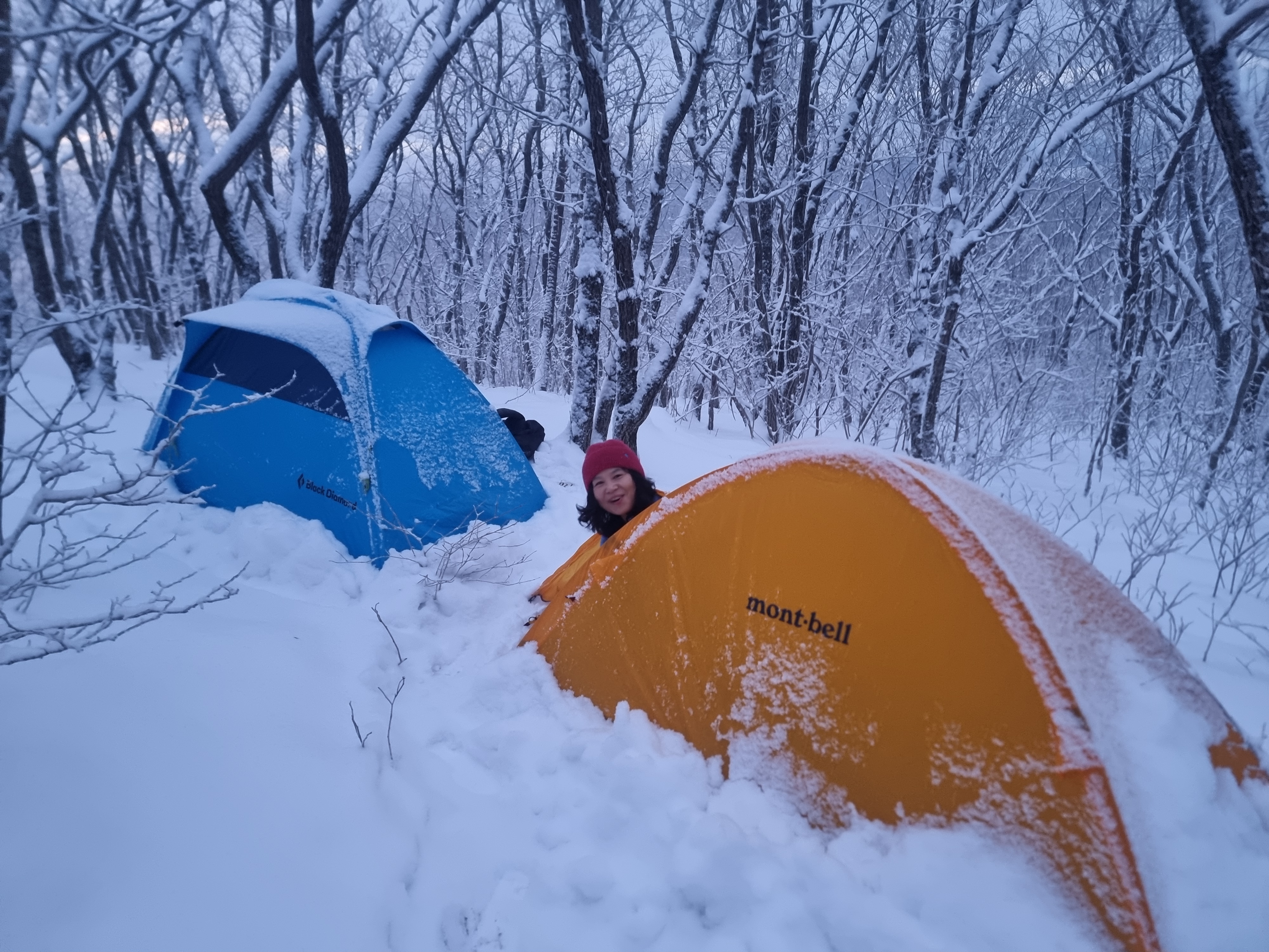 밤새 눈이 많이 내려서 텐트를 다 덮었다.